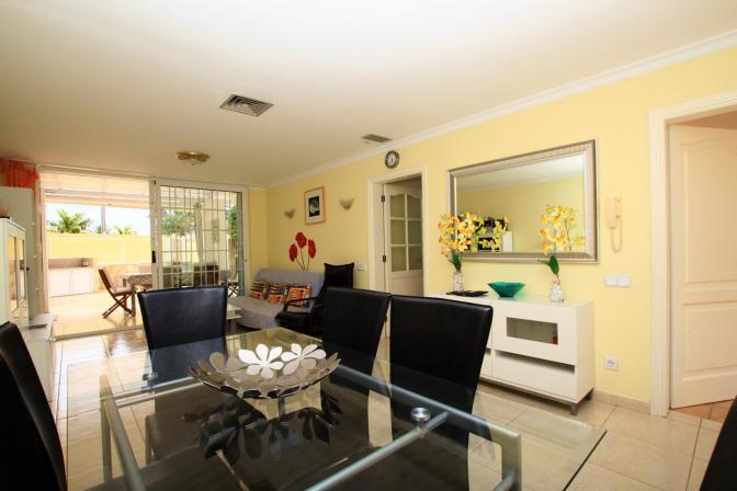 Bungalow for rent in Playa del Inglés (Gran Canaria) with 2 bedrooms, 2 bathrooms and a communal pool. Situated on a perfect place: near the restaurants and shopping centers, and yet in a walking distance from the beach. This beautiful bungalow has a garage, satelite TV, air condition and a storage...