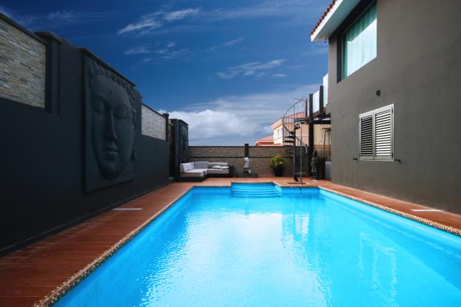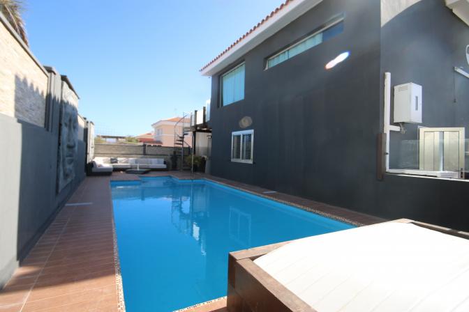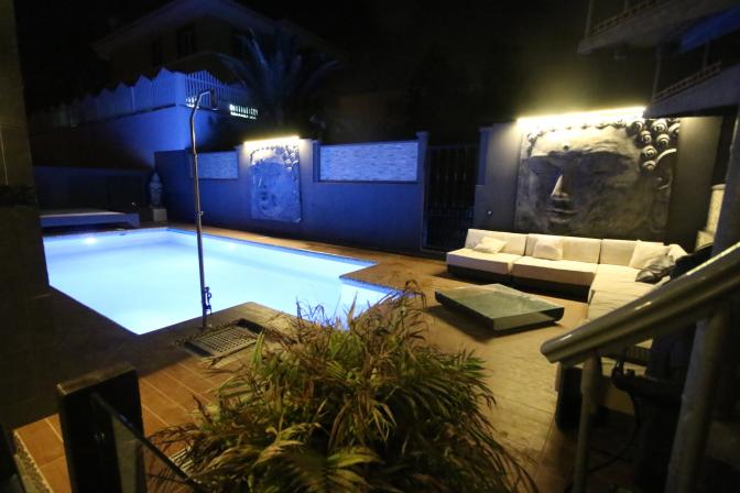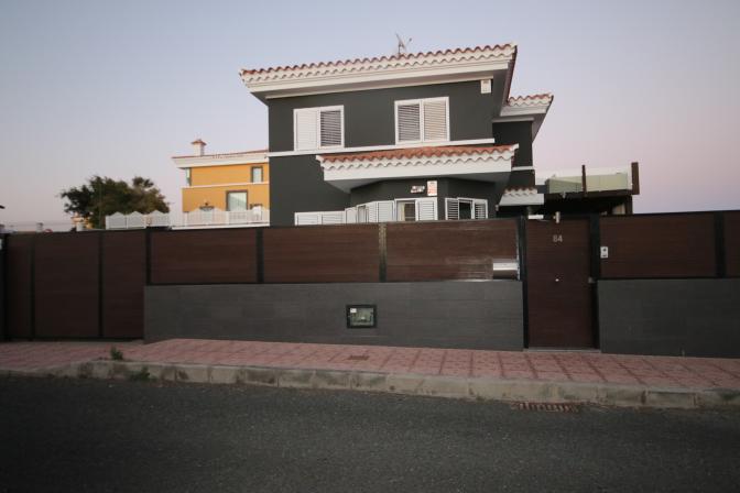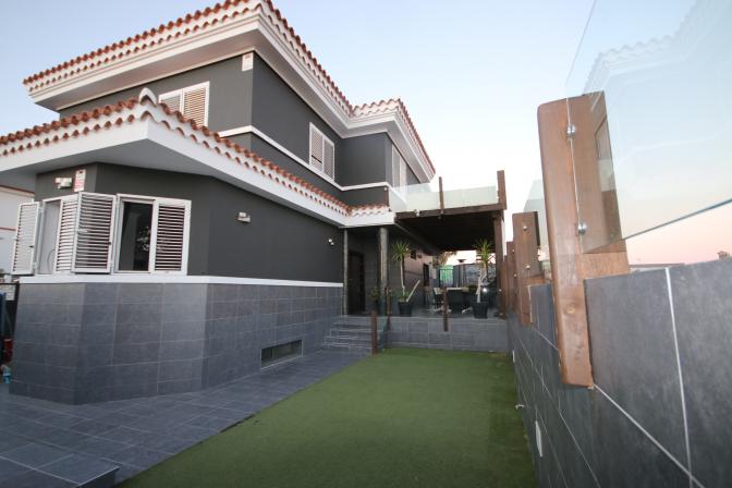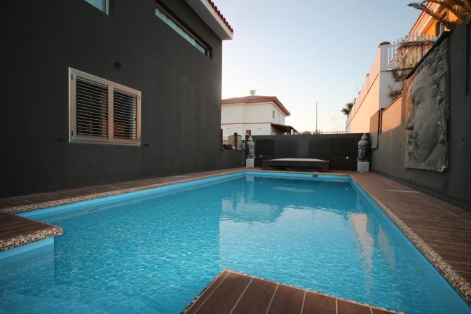 House in Meloneras (Gran Canaria). 5 bedrooms, 4 bathrooms, kitchen, large living room/ dining room, balcony , a storage room and a garage for 2 cars. 2 bedrooms include their own bathroom, walk in closets, windows with shutters. It is air conditioned, beautiful spacious garden and a private swimmin...