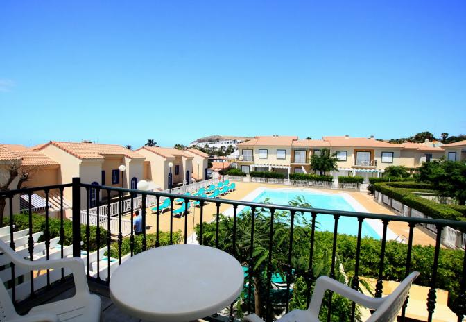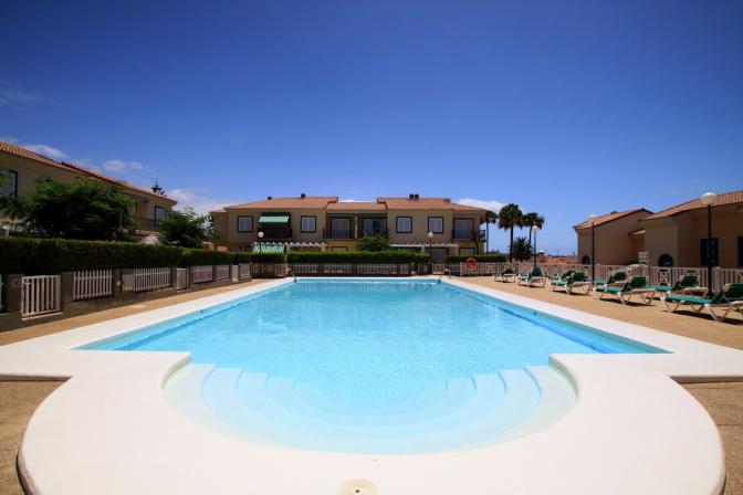 Bungalow (duplex) en alquiler en Pasito Blanco - Gran Canaria, de 3 dormitorios, 2 baños, balcón y terraza, piscina comunitaria y TV satélite. Situado en una de las zonas más bonitas del sur de Gran Canaria, y en el bonito y tranquilo complejo.